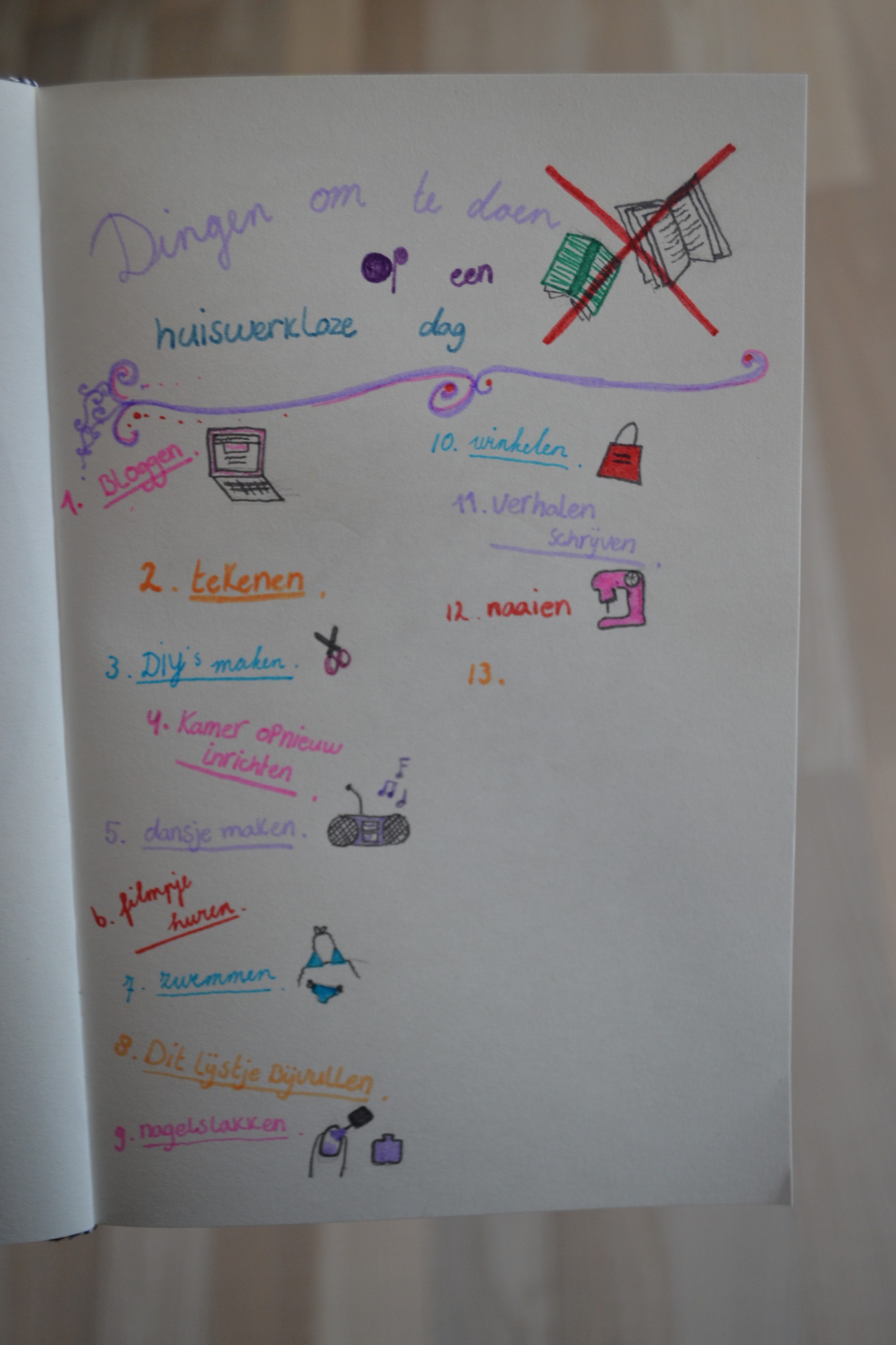 Het is vandaag 12 oktober, en dat betekent dat het herfstvakantie is! *maakt een vreugdedansje* Ik heb alleen een klein probleem, want ik weet nooit wat ik allemaal moet doen met zoveel vrije tijd. Daarom heb ik een lijstje gemaakt met "Dingen om te doen op een huiswekloze dag". Om het lijstje te maken, heb ik allemaal leuke ideetjes verzameld en opgeschreven. Ook heb ik er tekeningetjes bij gemaakt en verschillende kleuren gebruikt om het wat leuker te maken :).
